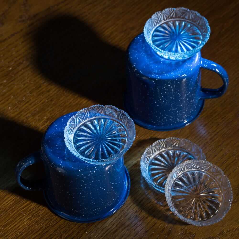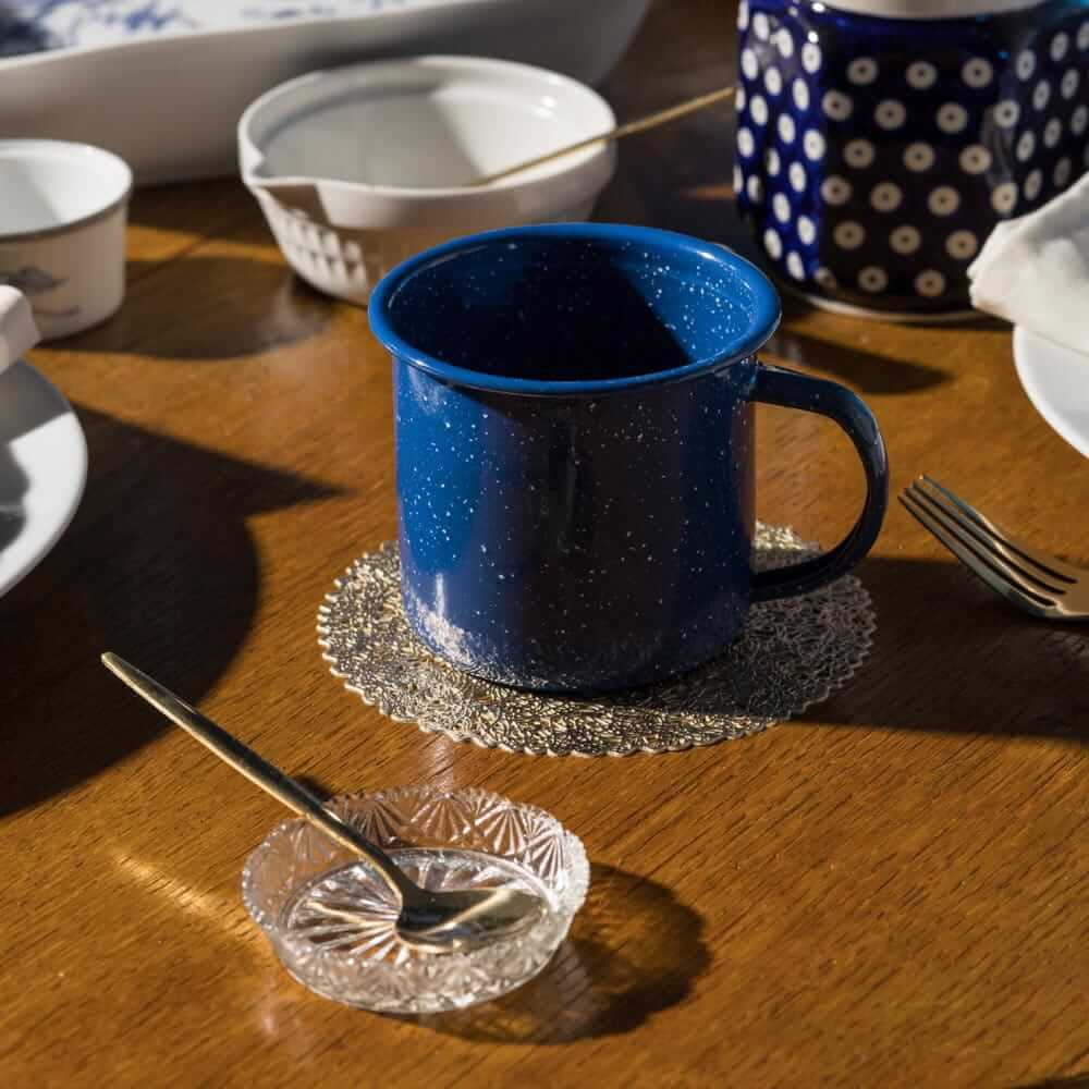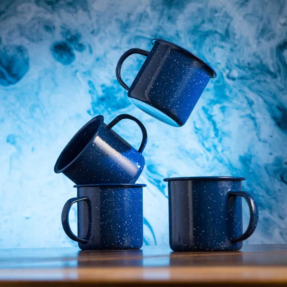- 4 kubki emaliowane w kolorze ciemno niebieskim 0,35 l, średnica 8 cm