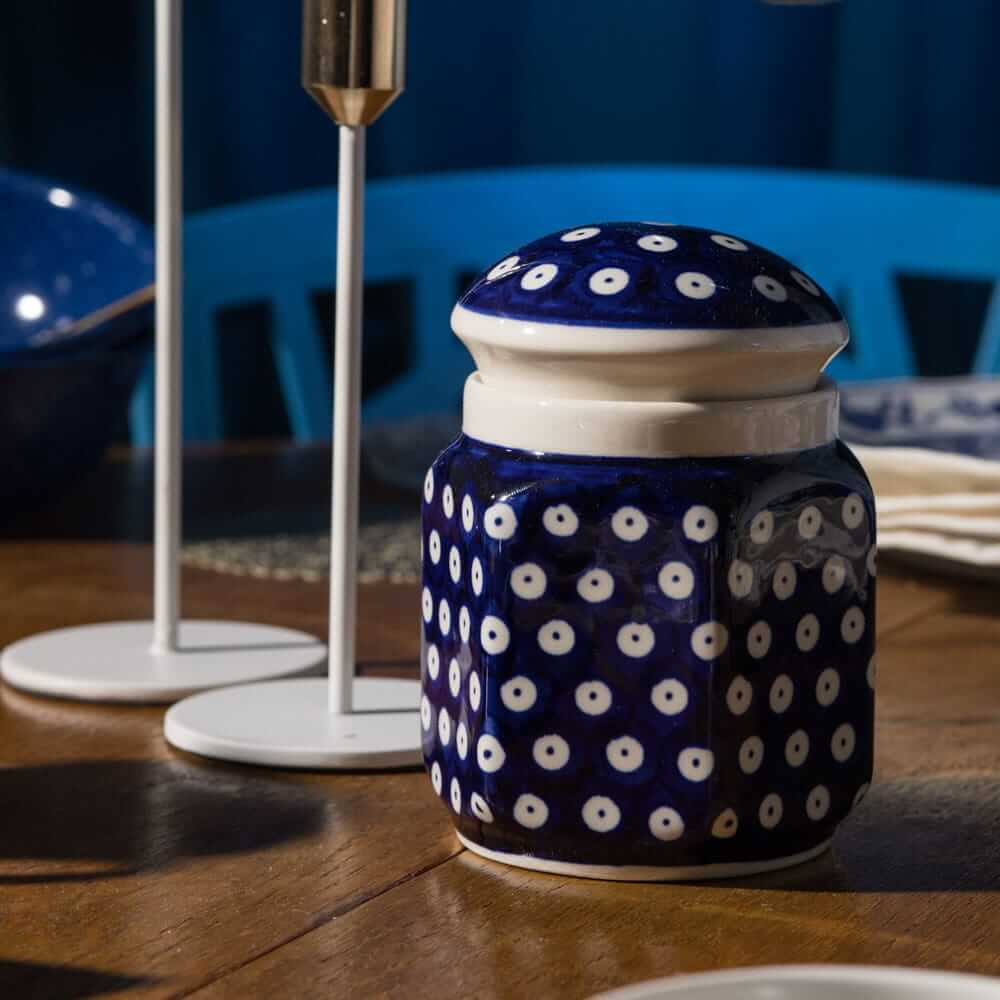 - 1 pojemnik Bolesławiec z kamionki, dekoracja 42, wysokość 13 cm, średnica 10 cm, pojemność 0,4 l.